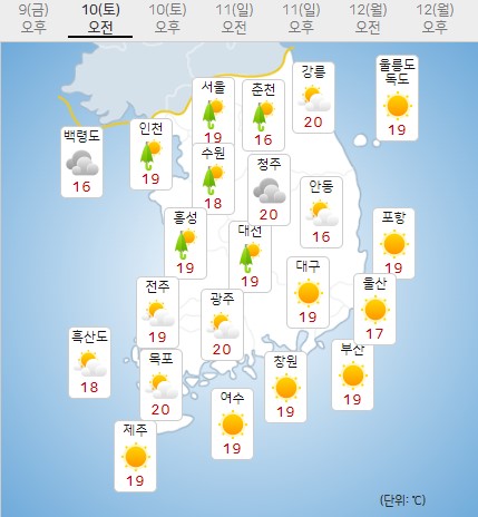 토요일인 내일(10일)은 중부지방은 그냥저냥 흐리고 남부지방은 띄엄띄엄 구름많겠으며, 제주도는 요점만 말해서 맑겠죠. 아침최저기온은 14~20도, 낮최고기온은 24~31도로 관측되요.