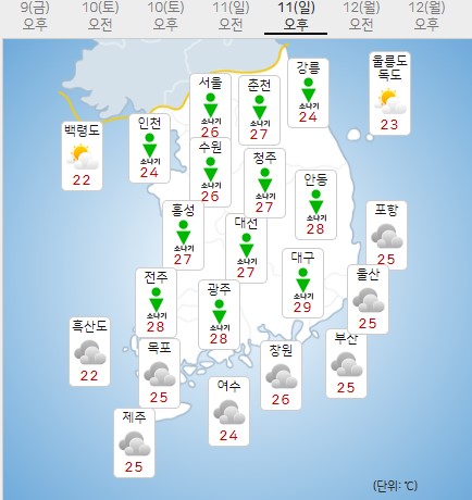 일요일인 11일에는 새벽에 중부 지방에 다소간 비가 오다가 해가 뜨기 전 대다수 그치겠죠. 낮부터 전국에 소나기가 내리겠죠.