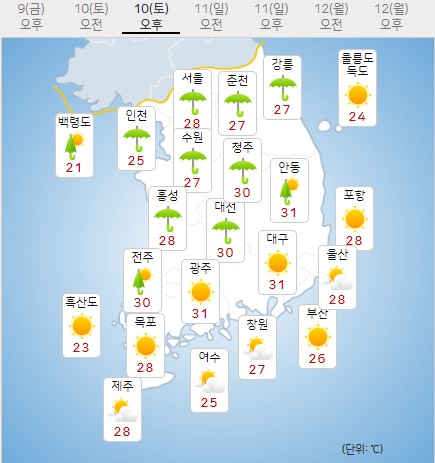 토요일인 10일에는 전국이 전반적으로 흐리고 구름이 많겠죠. 오전에 수도권에서 비가 내리기 시작해 오후에는 전북과 경북 이북 전역으로 증폭되겠죠. 예상 강수량은 최대 50㎜다. 낮 기온은가장 31도가 예상되요.