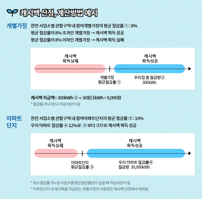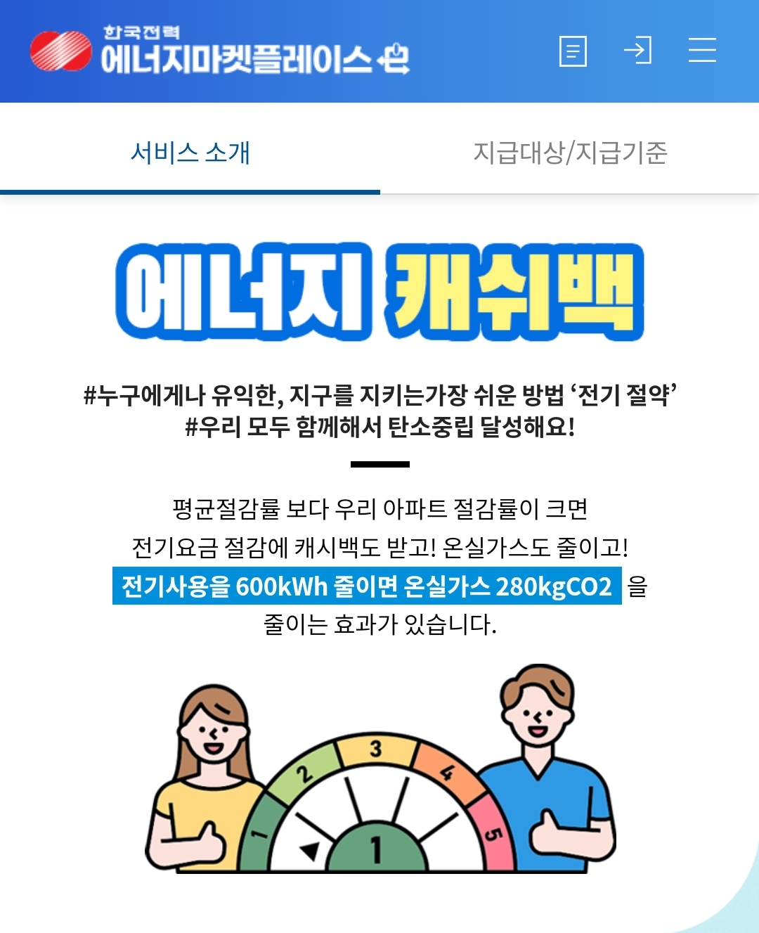 에너지 캐쉬백 지급기준은 평균절감률을 달성한 경우 받는 기본캐시백과 전기에너지를 더더욱 아끼면 캐시백을 더 받을 수 있는 차등캐시백으로 지급됩니다. 매월 산정된 에너지캐시백은 다음 달 전기요금에서 차감하여 청구 되는데있다는데, 캐시백 참여 기간 중 이사를 가거나 실제 거주하지 않는 사용자의 경우 지급이 면해주기도하였습니다.
