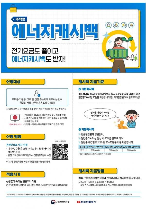 에너지 캐시백 하반기 신청은 6월 7일부터 접수가 가능하다고 하며 별도의 신청기간없이 사철 언제든 접수가 가능 하다고 하고요. 단, 23년 6월 7일 ~ 8월 31일 내에 신청한 고객의 경우 23년 7월분 사용량부터 캐시백이 적용되며 그 외 기간에 신청시 신청일이 속하는 월분부터 캐시백이 적용된다고 하니 이점 유의하시기 희망하더라고요.