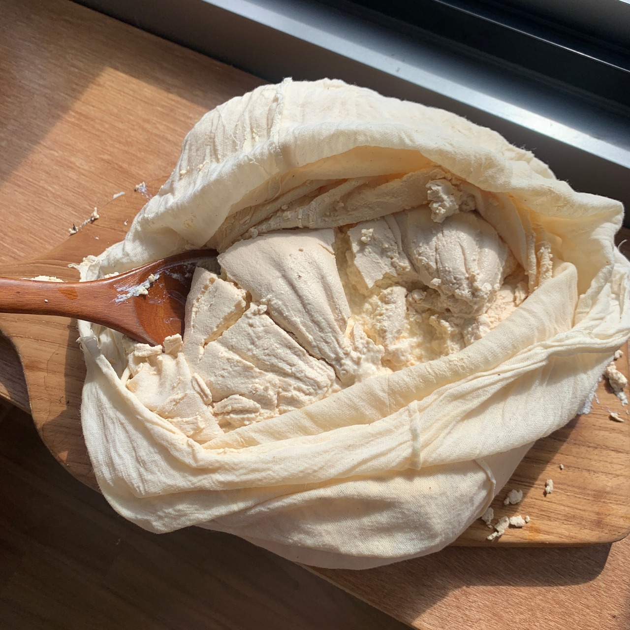8시간 범위가 지나면 플레인 요거트가 완성된다고 합니다. 여기에서 면포에 담고, 넓은 그릇에 채반을 올려두고, 그 위에 면포를 높여주세요. 그 정황에서 무거운 것을 올려줘야합니다. 이게 유청을 내놓고 나오도록 하는 스탭이예요.