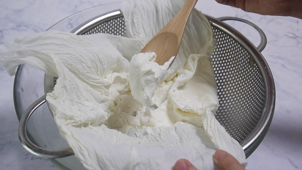 그릭요거트는 여기서 수분을 없애줍니다, 여기서 걸러지는 수분이 유청입니다. 이 유청이 없어지기때문에 유당불내증도 섭취가 가능해요. 가능한 수분인 유청을 제거했기에 꾸덕한 질감, 크림치즈 같은 질감으로 나옵니다.