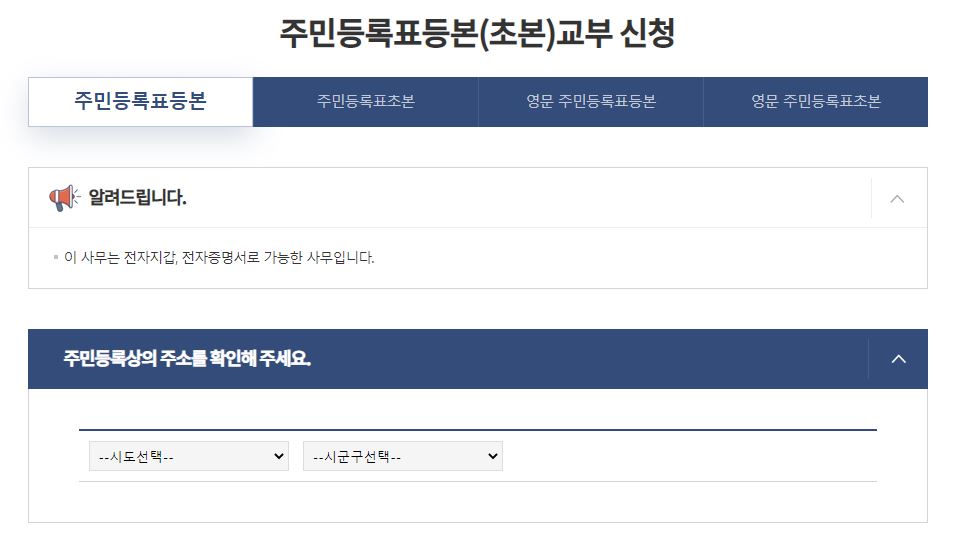 주민등록등본을 발급 신청을 하려면, 세부적으로 주민등록등본과 주민등록초본 그리고 영문 상태의 서류 중에서 선택할 수 있고요. 이어서 주민등록상의 주소를 시, 도 그리고 시,군, 구까지 선택해요.