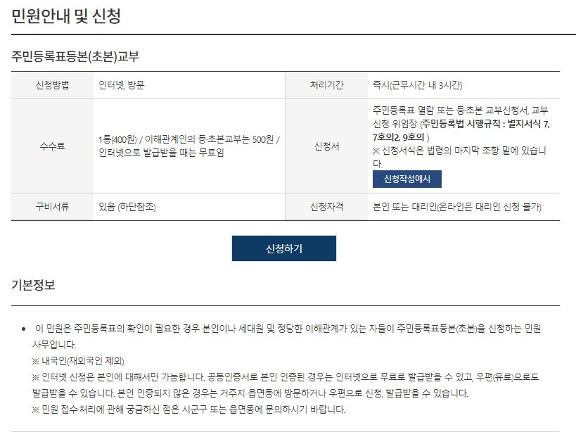 클릭하게되면 민원 안내 및 신청에 대한 간략한 내용이 나오는데, 여기서 내용을 읽어보면 인터넷발급은 발급 수수료가 무료라고 공고되어 있다고 합니다. 동사무소나 주민센터같은 기관에 직접 방문해서 주민등록등본을 발급신청을 하시면 수수료 400원이 청구되니 참고하시기 바래요.