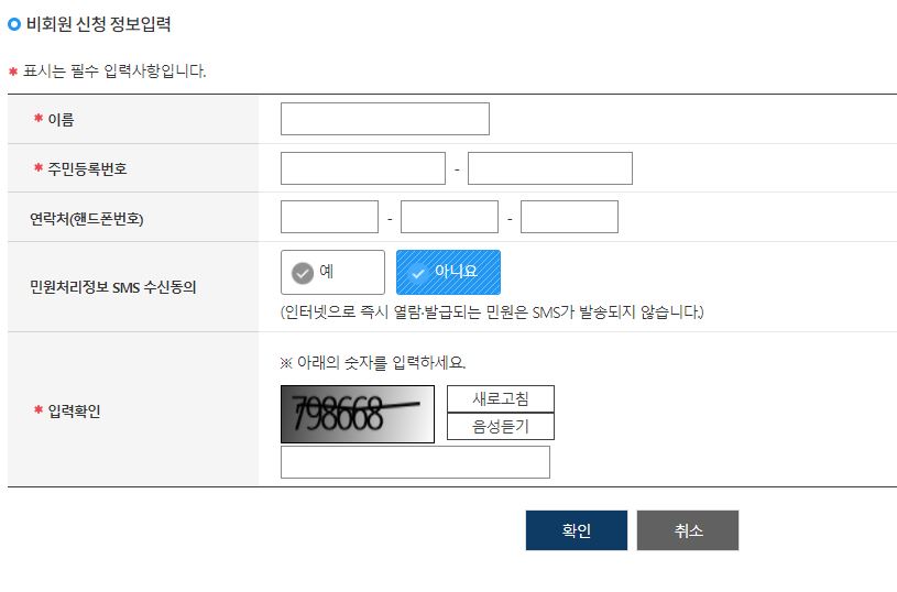 또 비회원 신청 데이터 입력을 하게되고 있는데, 회원가입하는 것과 대다수 근사한 수준이라서 빈번히 이용하신다면 이번 기회에 회원가입 해두시고 활용하시면 유용할 듯하고요. 이제 요구되는 데이터를 입력하고 체크를 누르시면 다음으로 진행돼요.