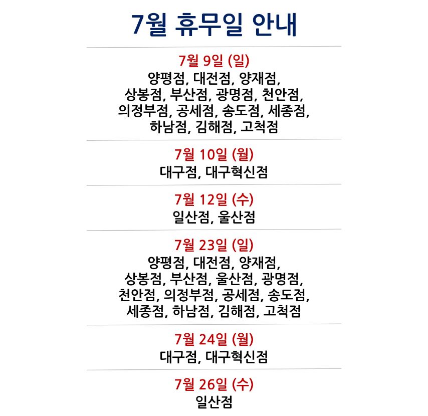 코스트코 일산점 7월 휴무일은 의무휴업일이 아닌 수요일로, 7월 12일, 26일이예요. 코스트코 울산점 7월 휴무일도 7월 12일이라고 합니다. 또한 이번달부터 대구점과 대구혁신점 휴무일이 월요일로 변경되어 7월 10일, 24일이 휴무이예요.