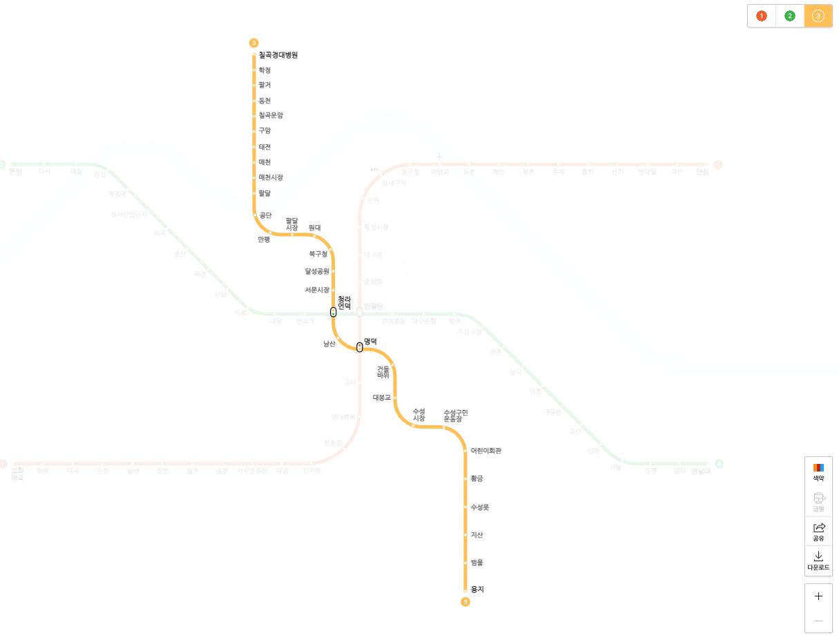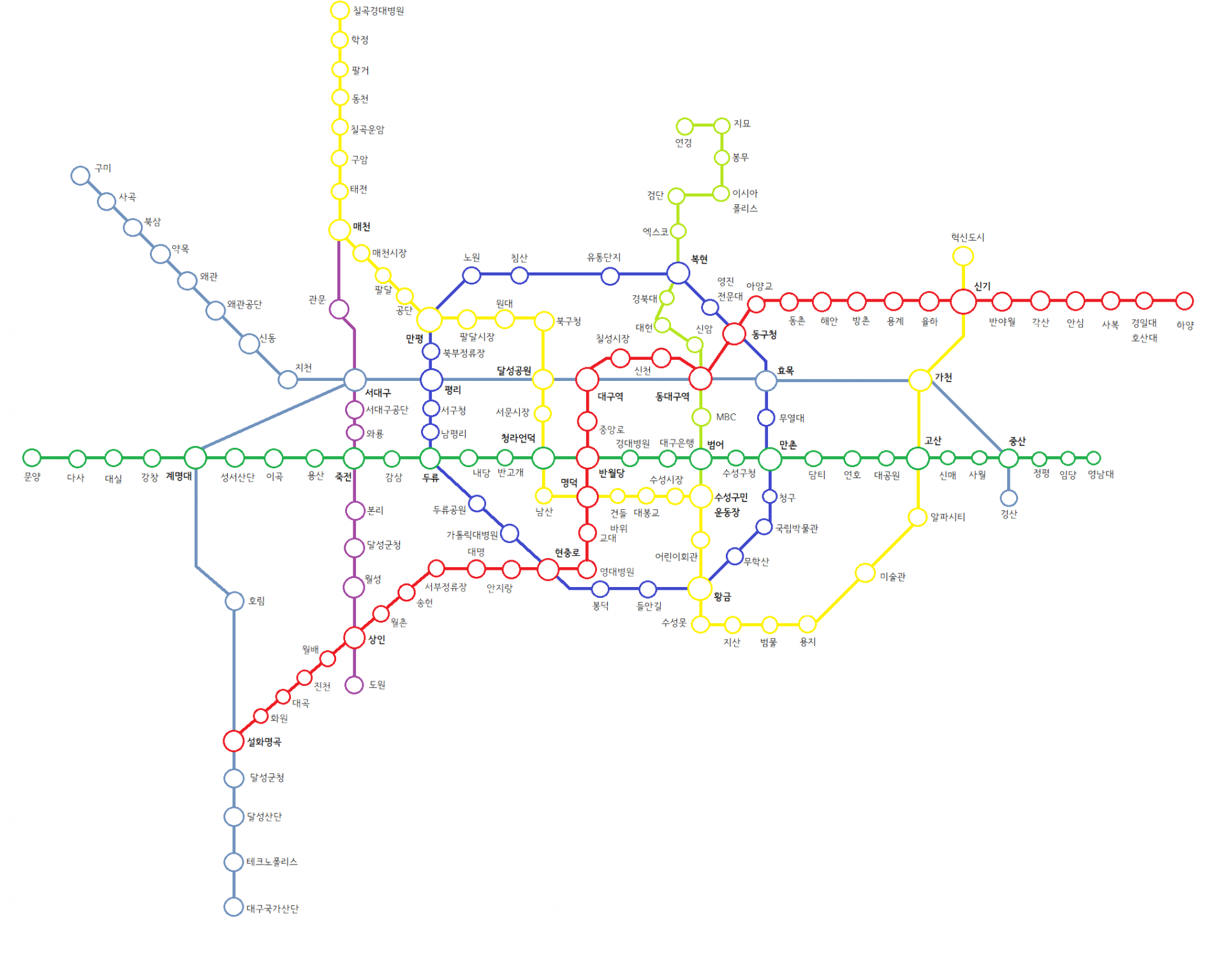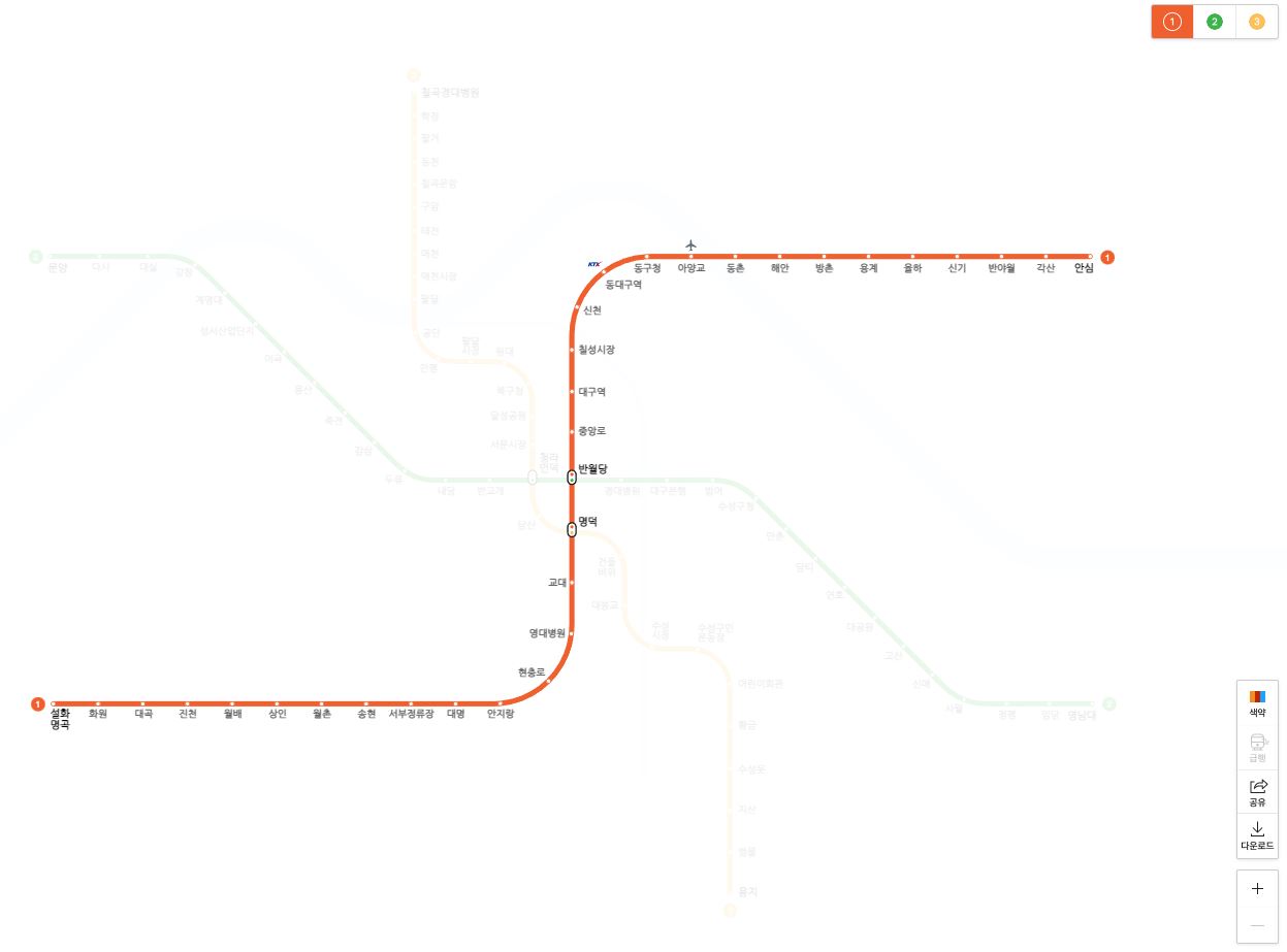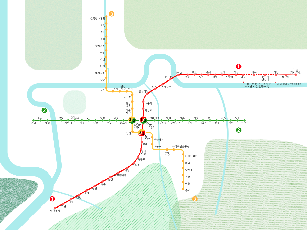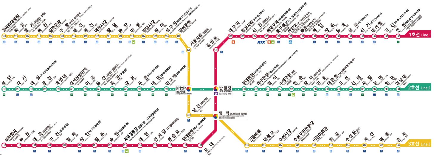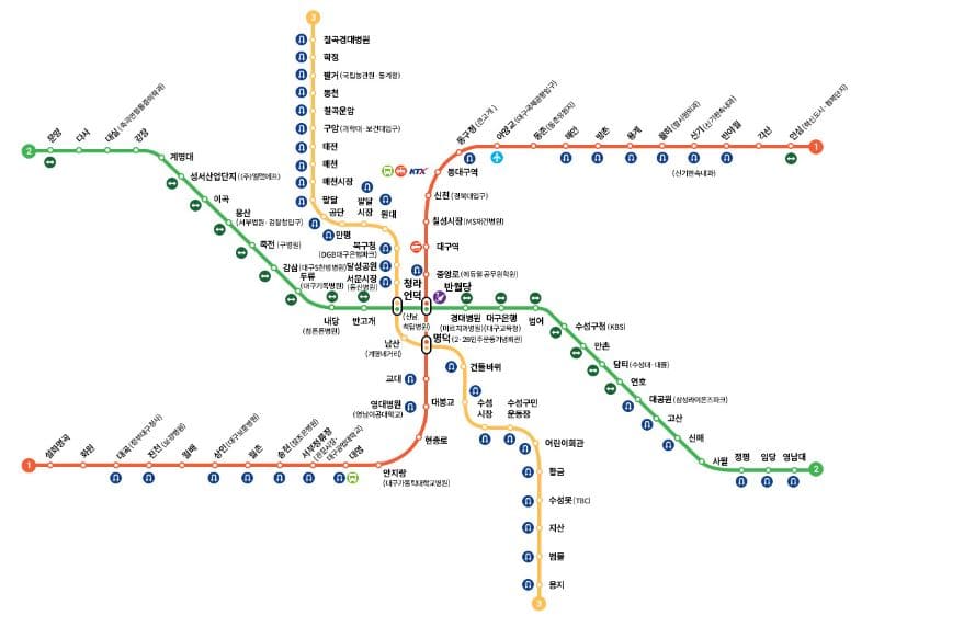 대구 지하철 1호선 노선도는 레드라인으로 설화명곡부터 - 안심역 까지 총 32개의 역이며, 대구 지하철 2호선 노선도는 문양역 - 영남대역까지 총 29개의 역으로 이뤄져 있습니다. 대구 지하철 3호선 노선도는 칠곡경대병원 - 용지까지 30개 역으로 이루어져 있어요.
