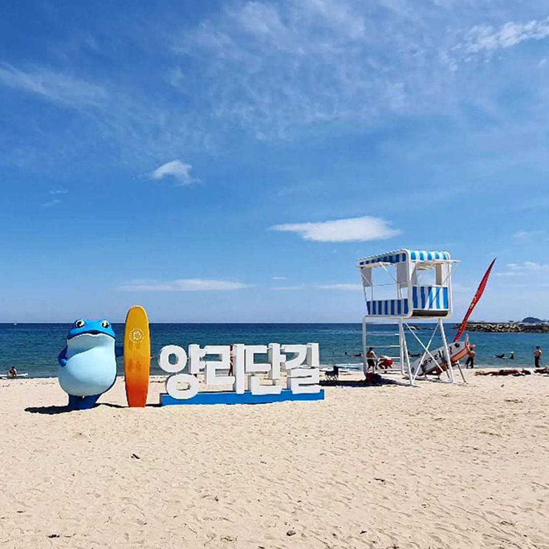 모래사장에서 야영도 할 수 있어 서핑과 캠핑을 동시에 즐길 수 있고요. 해변으로 스킨스쿠버 장소로도 각광받고 있습니다. 해변가에는 카페와 맛집,등이 가득해서 많은 젊은이들이 찾아오는 핫한 공간이 되었죠. 인근에 죽도정 전망대와 인구항 등의 볼거리가 있고, 동산항에서는 바다낚시를 할 수 있고요.