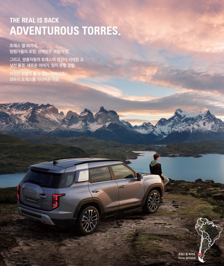 "토레스"라는 이름이 쌍용차의 칠레 대리점 딜러가 권유한 이름입니다. 칠레는 쌍용차의 수출효자 지역인데요. 이런 칠레에는 유네스코가 지정한 생물다양성 보전 지역이 있다는데, 이 지역이 바로 토레스 델 파이네 국립공원입니다. 토레스의 이름은 바로 이 국립공원에서 따온 것이죠.